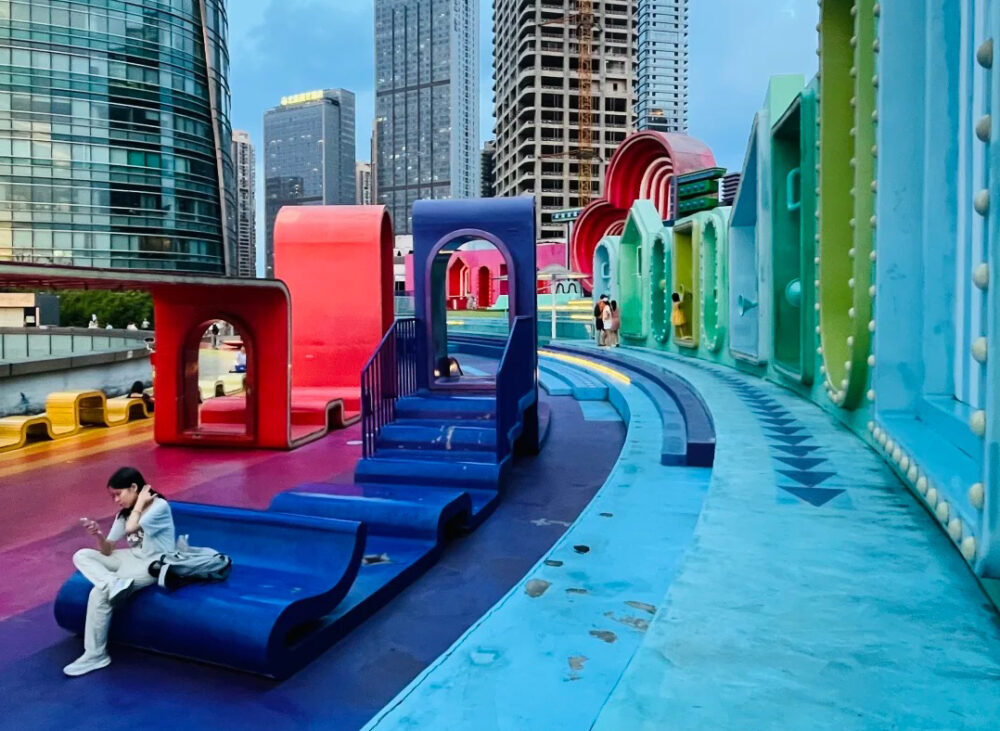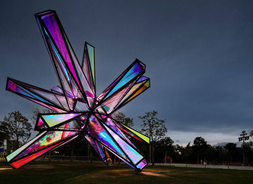 During the day, when you appreciate it from different angles, the color effect of the surface material refracted by different light rays will vary. At night, when the surrounding ambient light and artificial light go out, the lights and materials inside the device create a wonderful interaction, dazzling and eye-catching.
