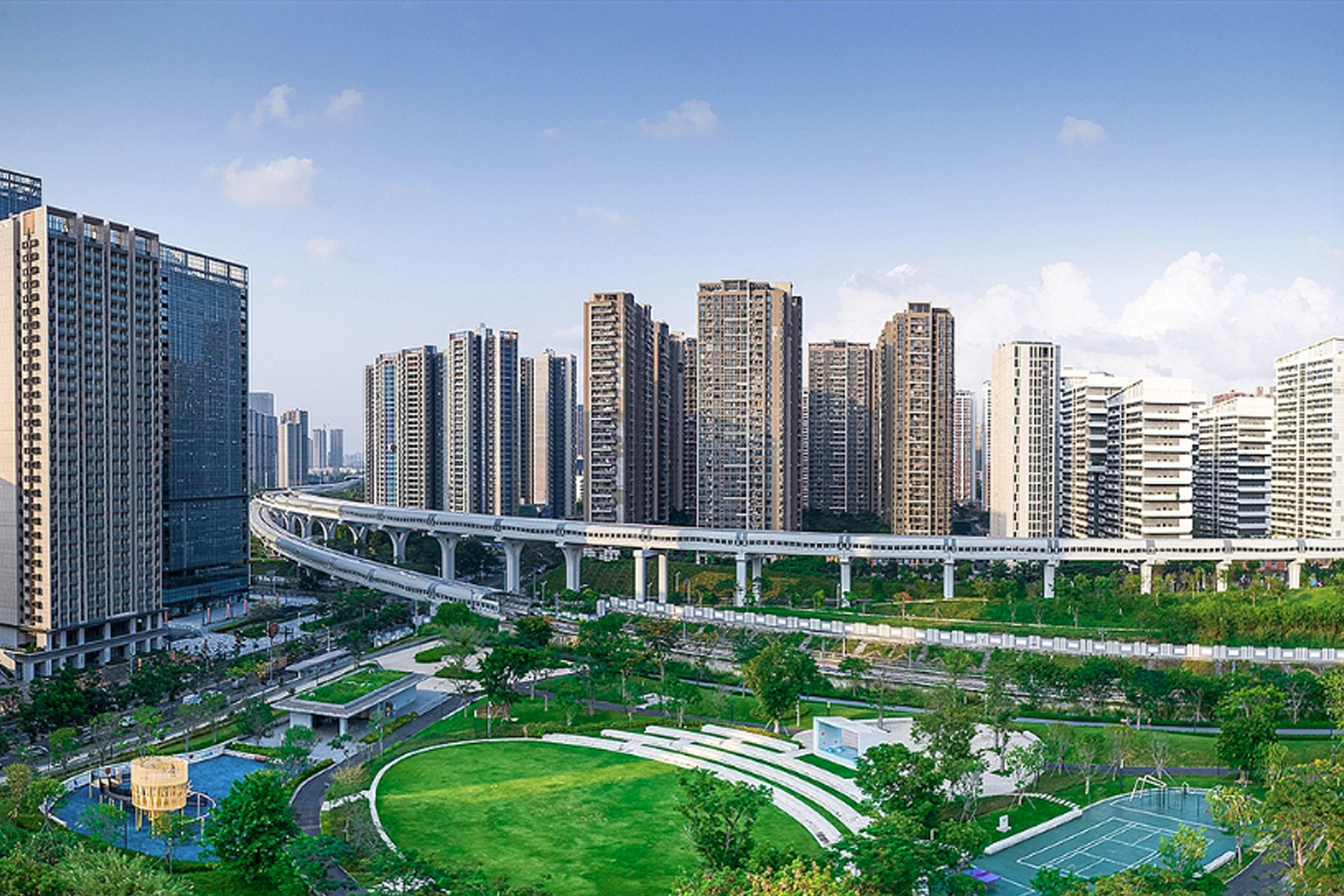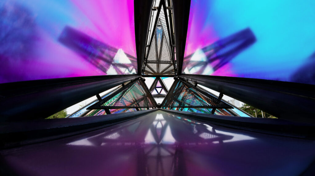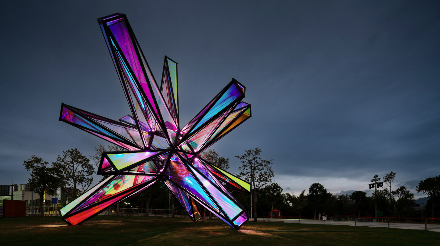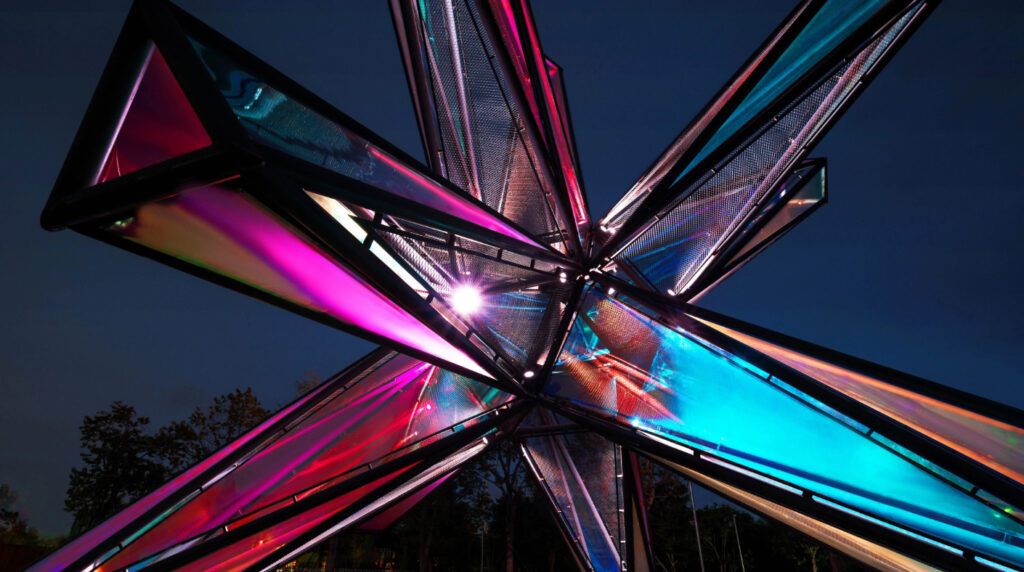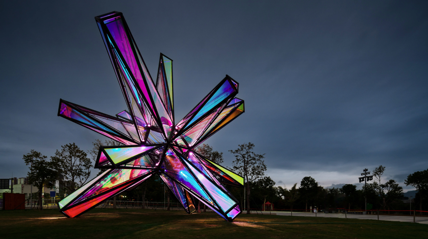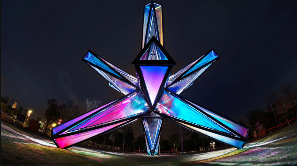 During the day, when you appreciate it from different angles, the color effect of the surface material refracted by different light rays will vary. At night, when the surrounding ambient light and artificial light go out, the lights and materials inside the device create a wonderful interaction, dazzling and eye-catching.
